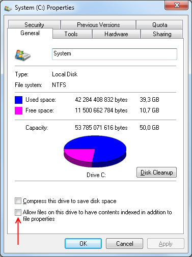 - Uncheck the "Allow files on this drive to have contents indexed in addition to file properties" (should be as in the image to the right)