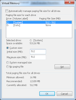 - Select Custom size and fill the initial and maximum size of your page file to be the same amount of space - 512 MB is more than enough if you have more than 4 GB of RAM (see the image on the right)